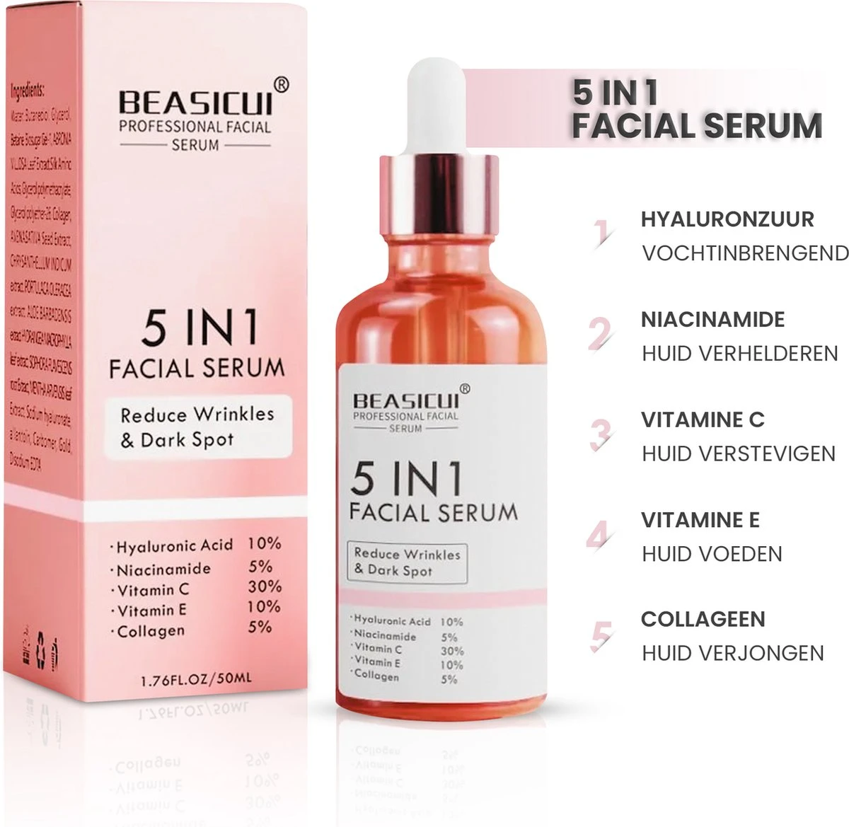 Onze formule bevat 30% pure vitamine C, een krachtige antioxidant die uw huid helpt te verhelderen en donkere vlekken en verkleuringen te verminderen. Bovendien stimuleert deze hoge concentratie vitamine C de collageenproductie, waardoor uw huid steviger en jeugdiger wordt.