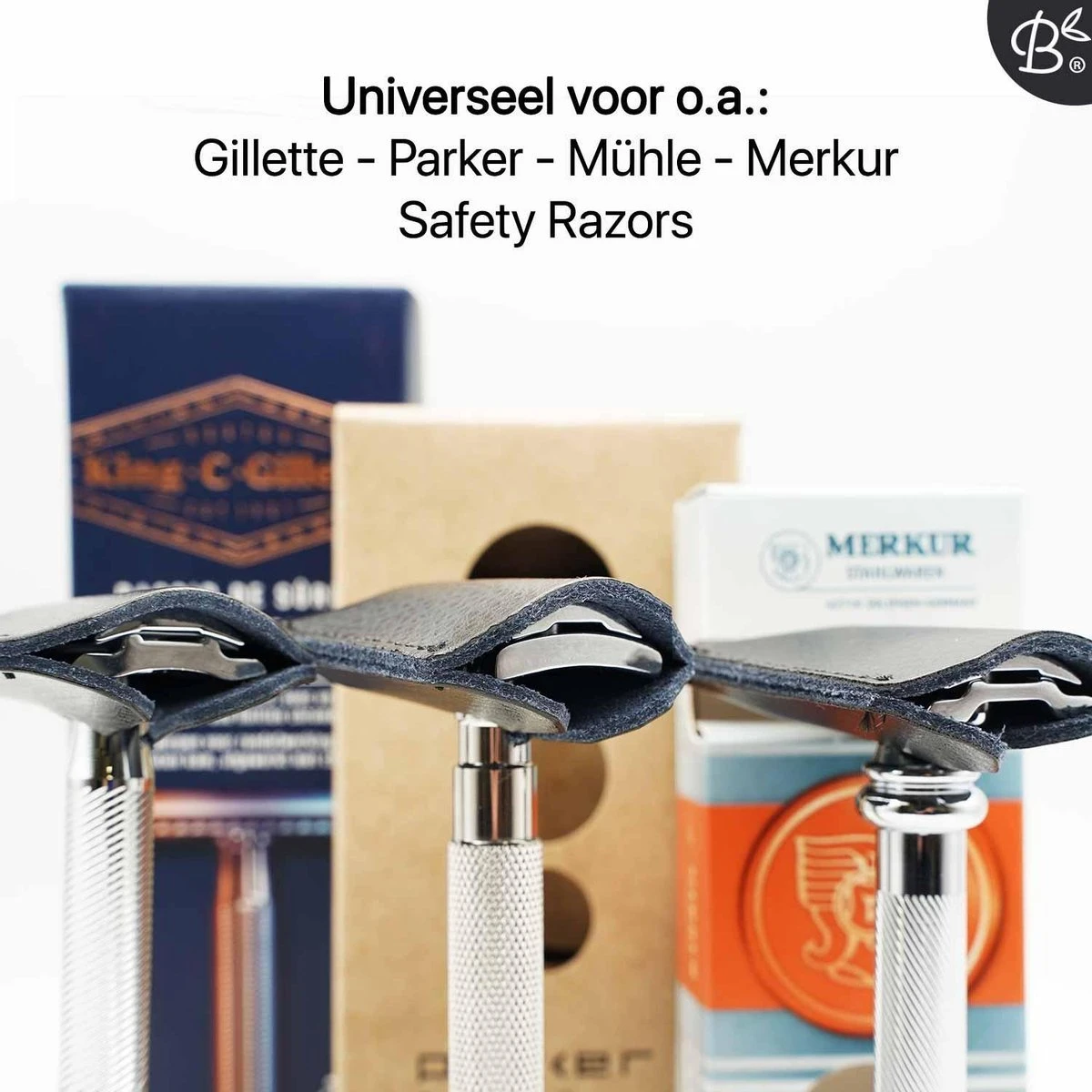 Luxe vegan leder reiskapje speciaal voor safety razors. Dit kapje beschermd de kop en het mesje van je safety razor. Makkelijk voor op reis. Ons inschuif systeem is zo gemaakt dat deze optimaal met één hand over je safety razor is te plaatsen.
