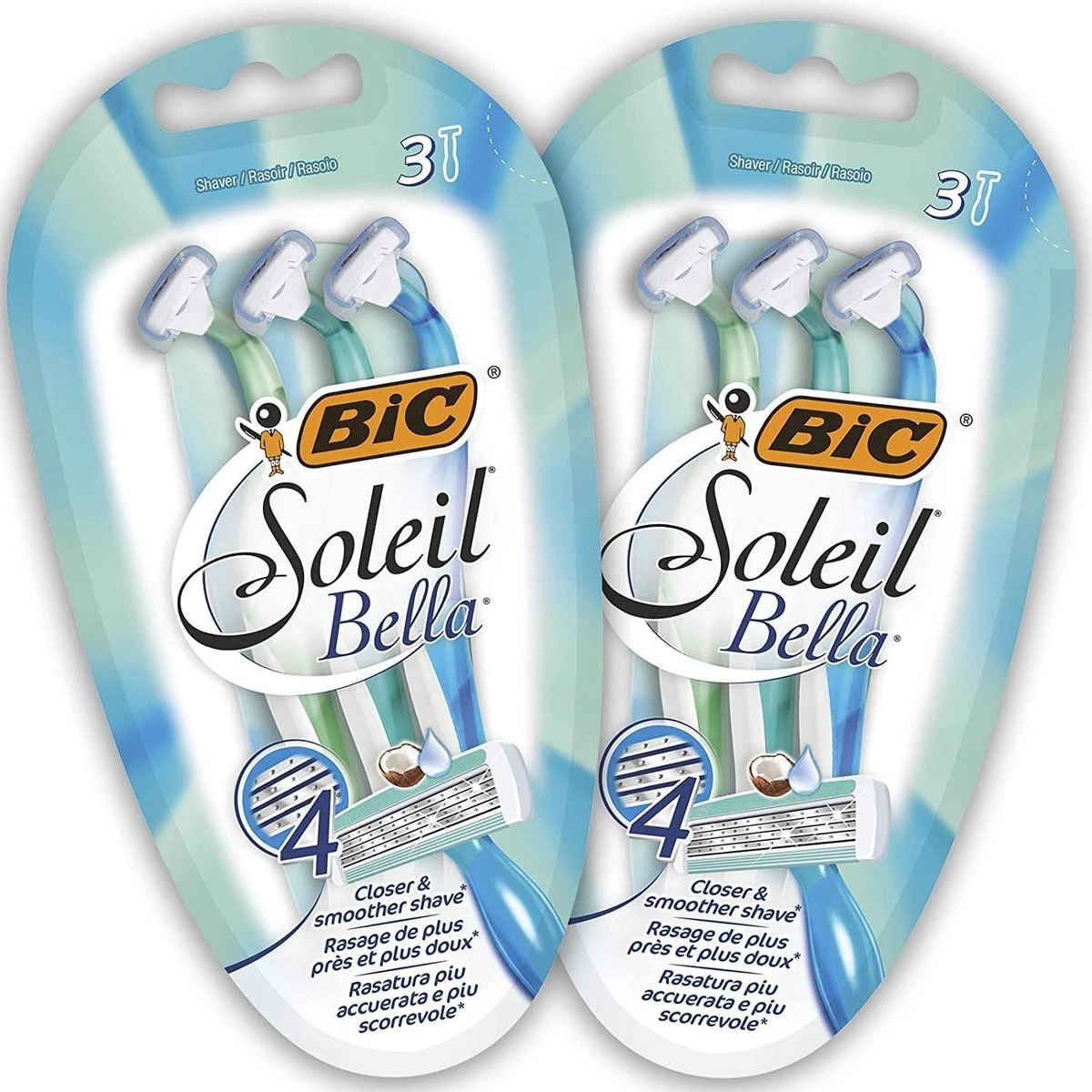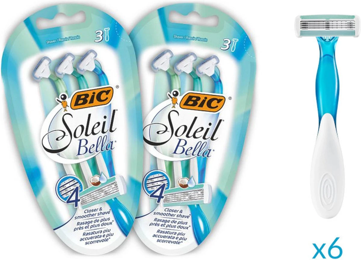 - Twee 3-packs BIC Soleil Bella wegwerpscheermes voor dames met 4 veergemonteerde beweegbare messen die onafhankelijk werken voor een zachte zijdezachte huid