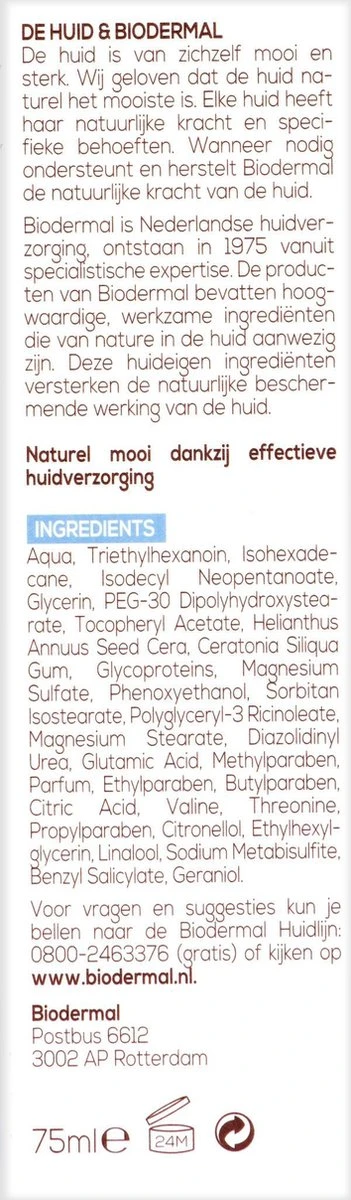 • Biodermal Dag en Nachtcrème is een rijke, effectieve crème en bevat zowel de verzachtende eigenschappen van een dagcrème als de voedende eigenschappen van een nachtcrème.