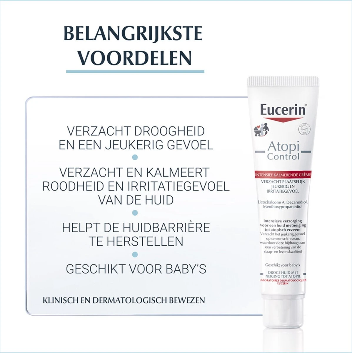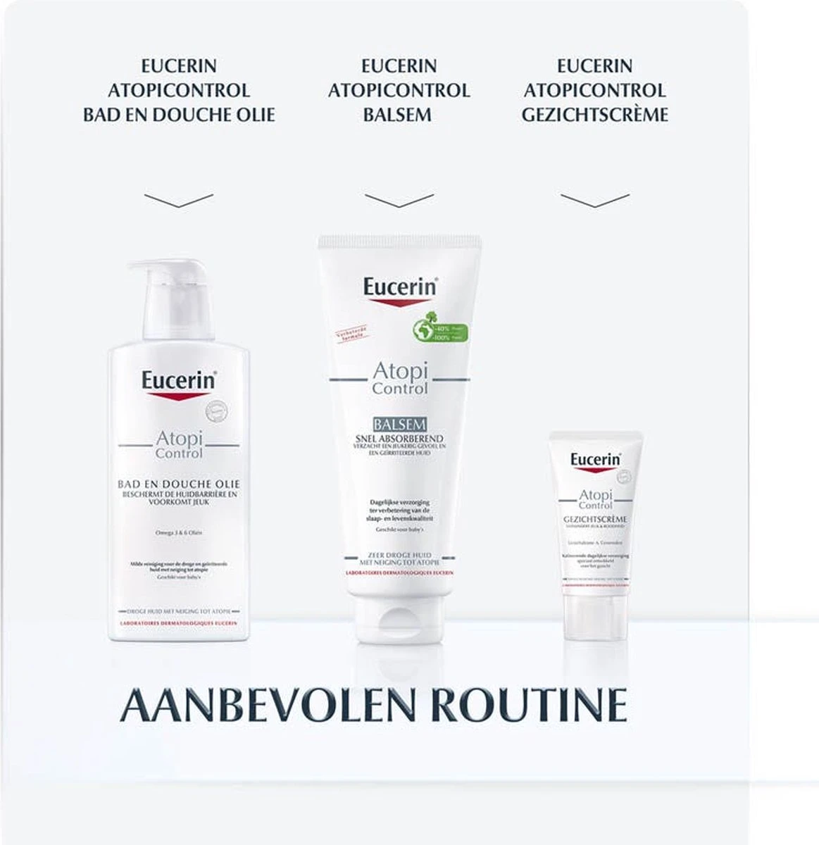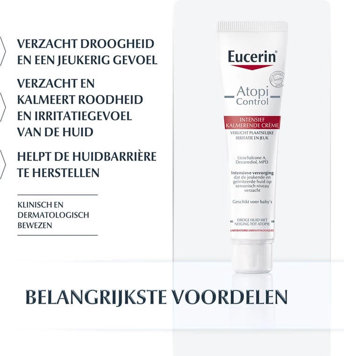 Eucerin AtopiControl Face Care Cream met 12% omega 6-vetzuren om een droge en harde huid te kalmeren en te voeden en de ontstekingsremmer en irritatieremmer licochalcone A, hydrateert, verzacht en vermindert ruwheid en verlicht tevens een jeukende en trekkerige huid. De huid voelt zacht aan en is merkbaar gladder. Er is klinisch bewezen dat deze geschikt is voor de atopische huid en kan worden gebruikt bij kinderen en baby’s ouder dan drie maanden.