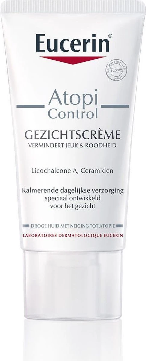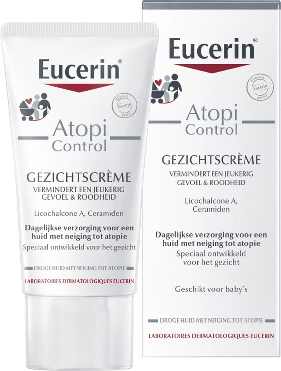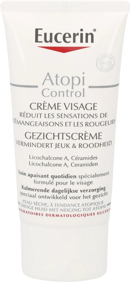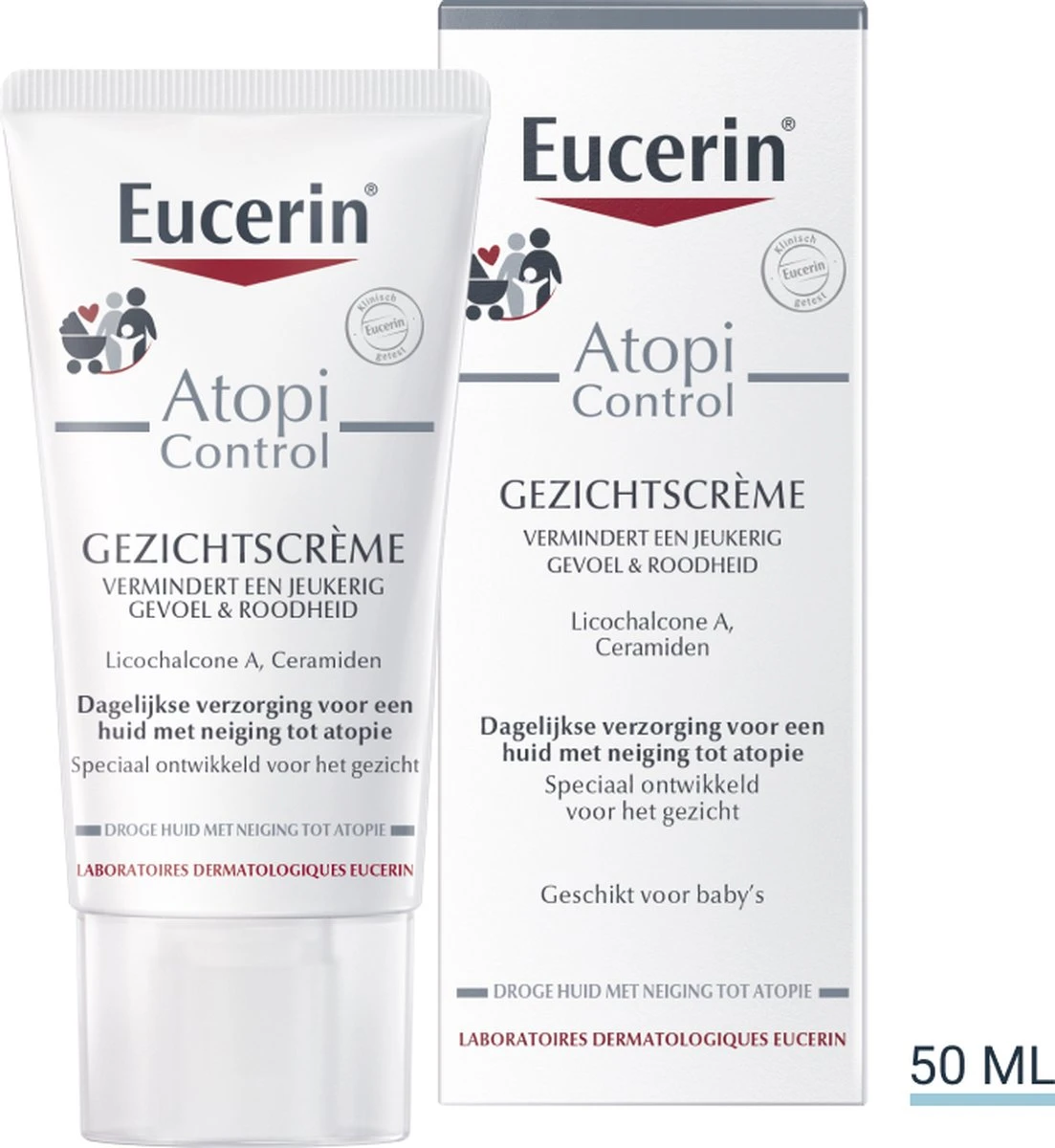 Eucerin AtopiControl Face Care Cream met 12% omega 6-vetzuren om een droge en harde huid te kalmeren en te voeden en de ontstekingsremmer en irritatieremmer licochalcone A, hydrateert, verzacht en vermindert ruwheid en verlicht tevens een jeukende en trekkerige huid. De huid voelt zacht aan en is merkbaar gladder. Er is klinisch bewezen dat deze geschikt is voor de atopische huid en kan worden gebruikt bij kinderen en baby’s ouder dan drie maanden.