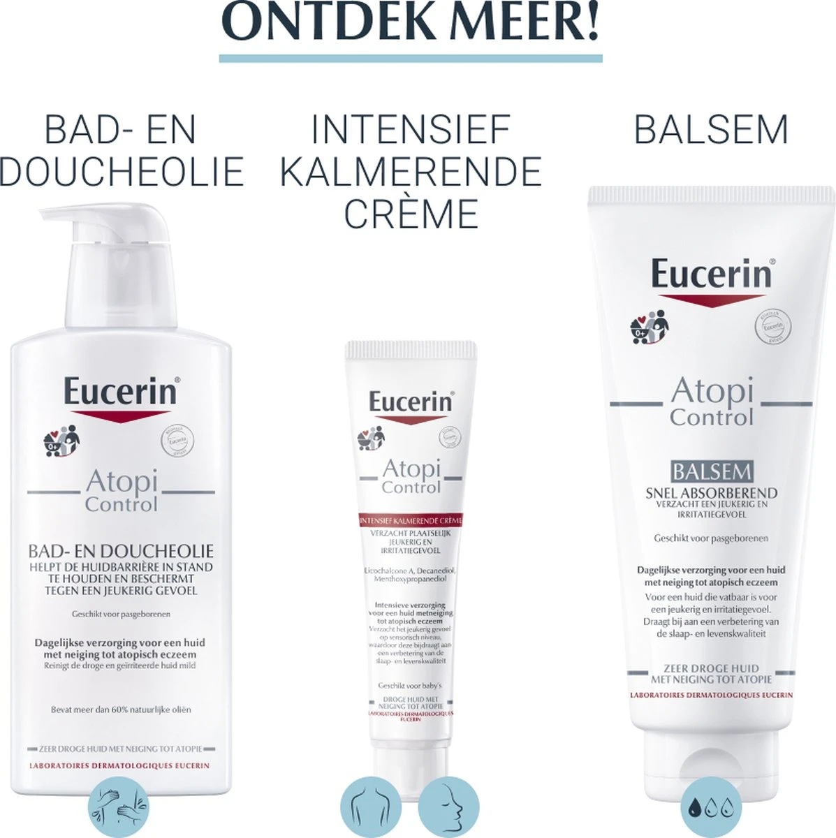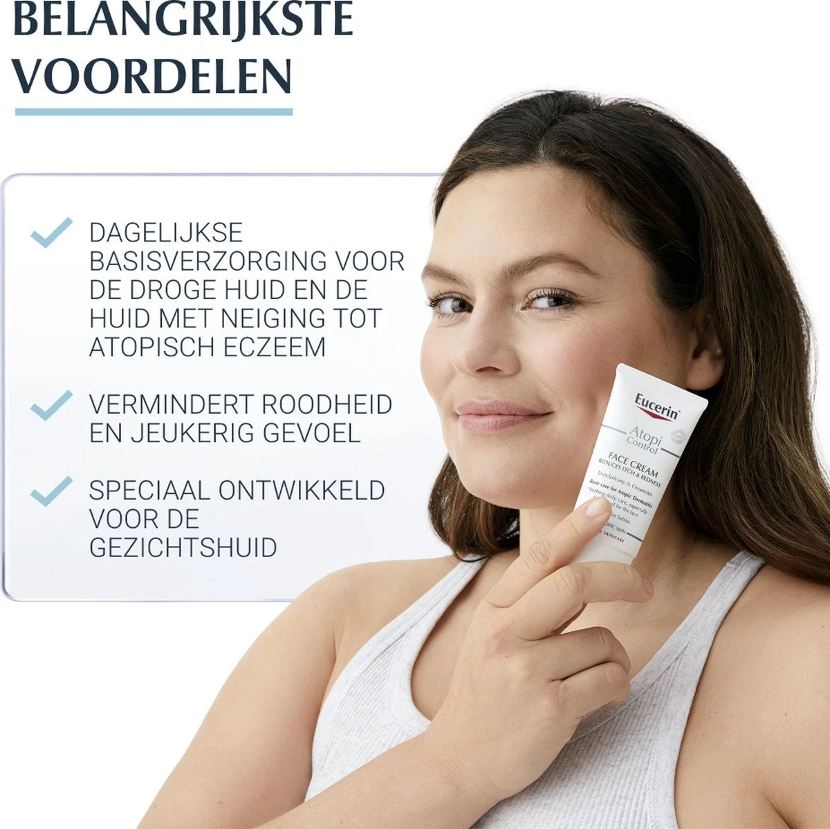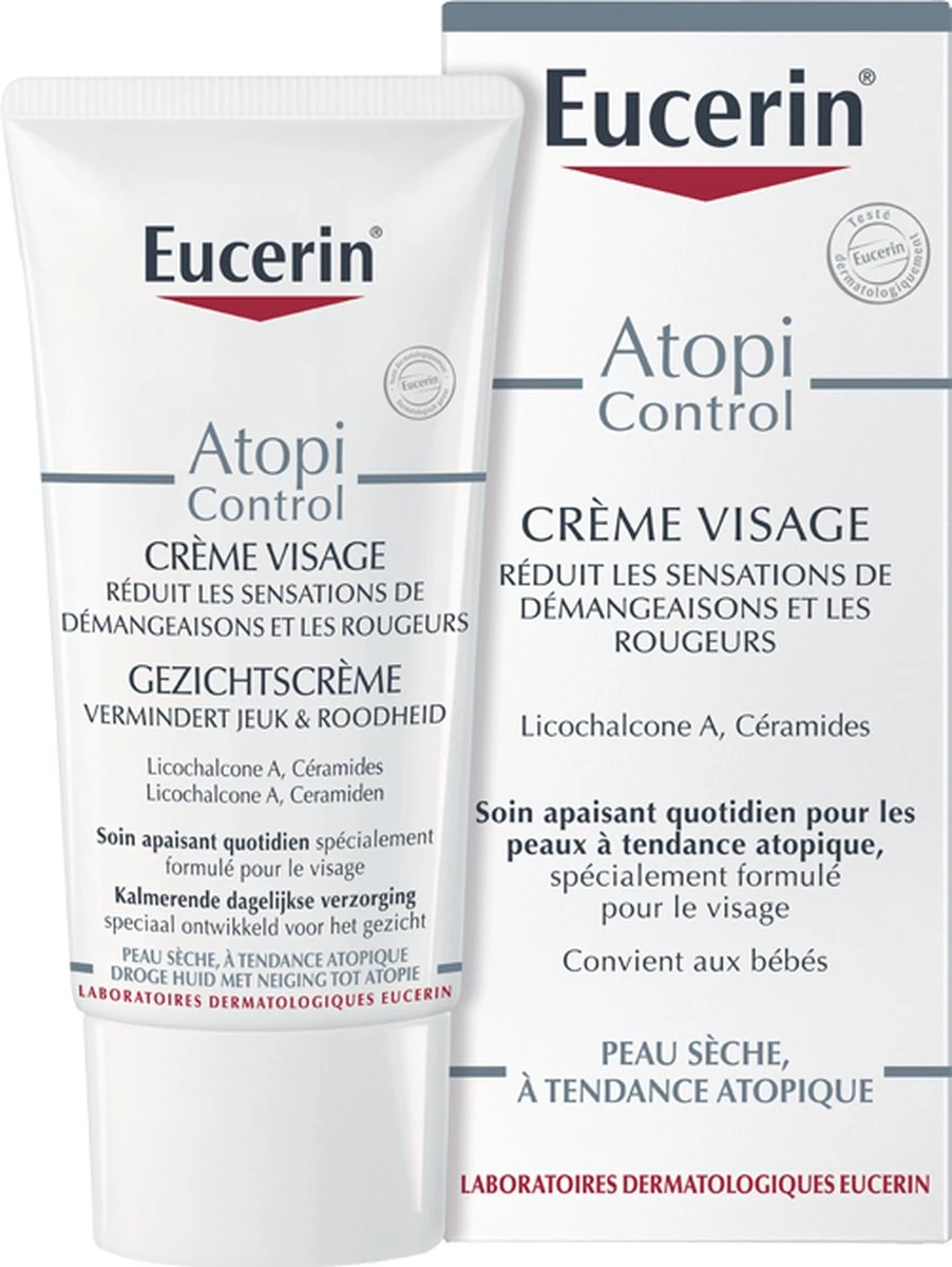 Eucerin AtopiControl Face Care Cream met 12% omega 6-vetzuren om een droge en harde huid te kalmeren en te voeden en de ontstekingsremmer en irritatieremmer licochalcone A, hydrateert, verzacht en vermindert ruwheid en verlicht tevens een jeukende en trekkerige huid. De huid voelt zacht aan en is merkbaar gladder. Er is klinisch bewezen dat deze geschikt is voor de atopische huid en kan worden gebruikt bij kinderen en baby’s ouder dan drie maanden.