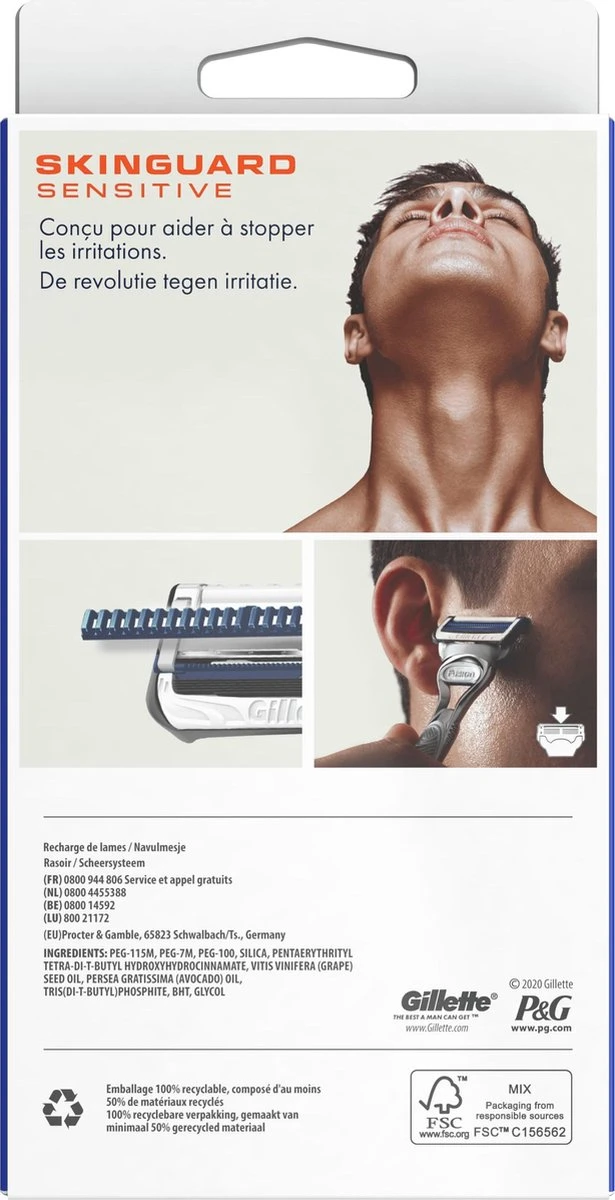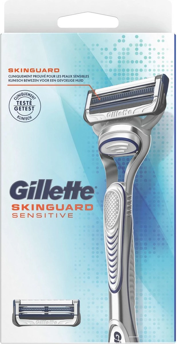 De Gillette SkinGuard Sensitive is het eerste scheermes van Gillette speciaal ontworpen voor mannen met een gevoelige huid. De unieke SkinGuard tussen de bladen absorbeert druk, maakt de huid plat en brengt de messen omhoog om het haar op huidniveau af te snijden, zodat irritatie voorkomen kan worden voor een verlichting die je kunt voelen. De 2 optimaal geplaatste mesjes minimaliseren het trekken aan haartjes. Het SkinGuard Sensitive scheermes is klinisch bewezen voor een gevoelige huid en geeft je de betrouwbare scheerbeurt die je verwacht van een Gillette scheermesje.