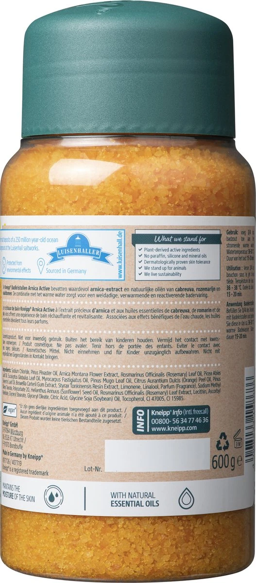 De Kneipp® badkristallen Arnica Active bevatten waardevol arnica-extract en natuurlijke oliën van cabreuva, rozemarijn en naaldbomen. De combinatie met het warme water zorgt voor een weldadige, verwarmende en reactiverende badervaring.