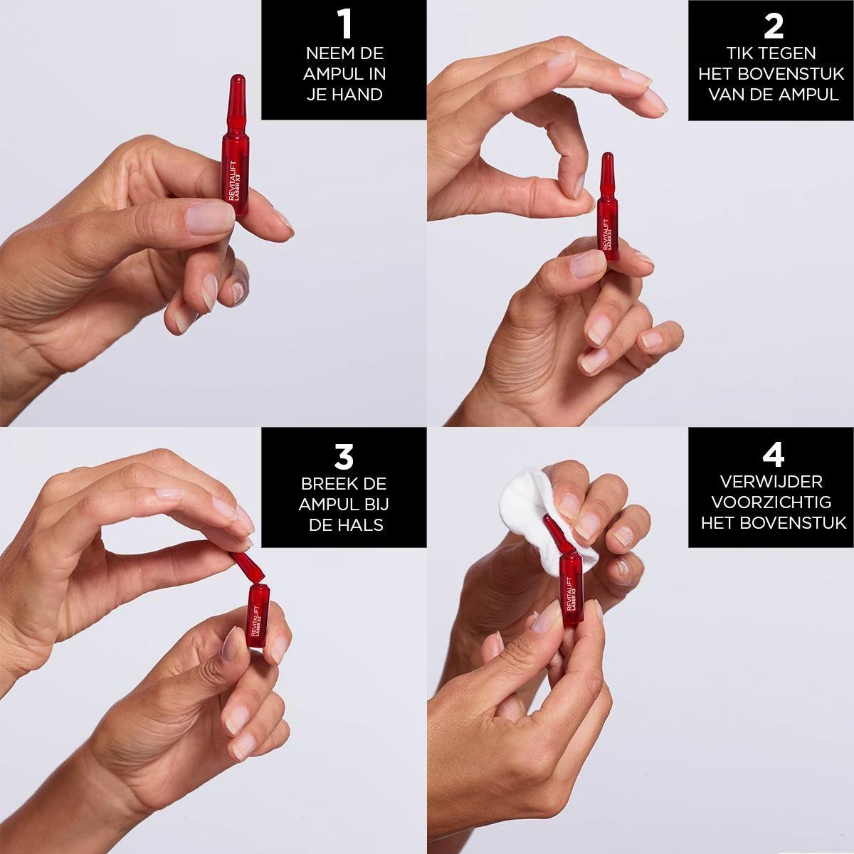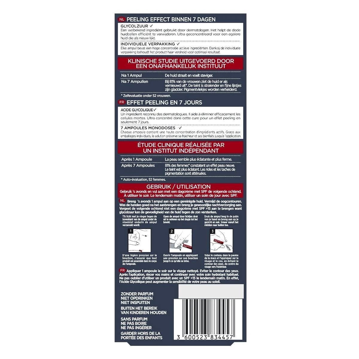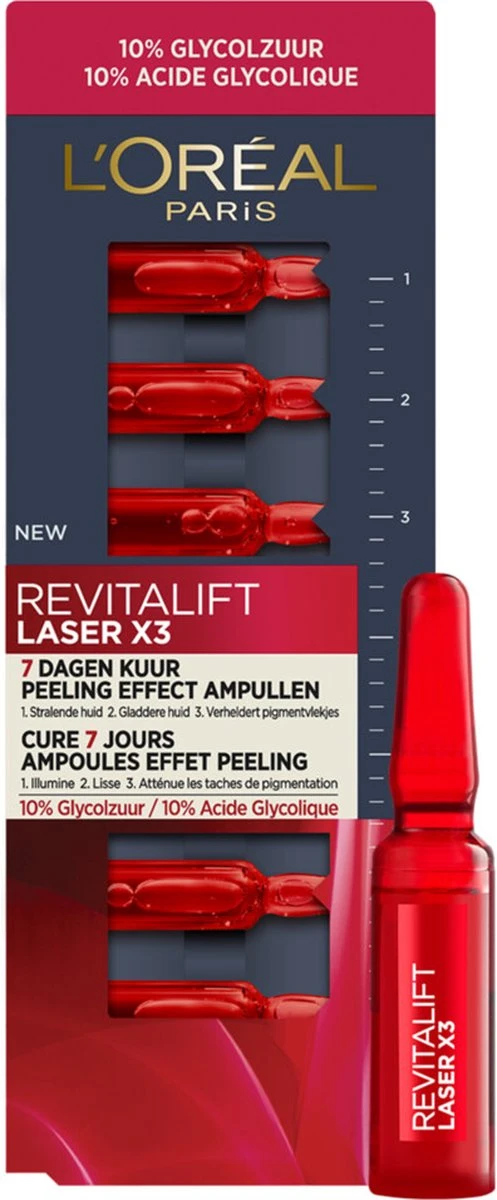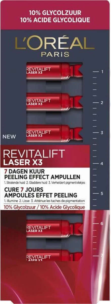 De nieuwste innovatie binnen gezichtsverzorging van Revitalift Laser X3: Peeling Effect Ampullen. Na deze 7 dagen durende kuur is de huid als nieuw. De hoge concentratie van 10% glycolzuur helpt dode huidcellen effectief verwijderen waardoor de huid weer gaat stralen en het huidoppervlak egaliseert. De individuele verpakking van elke ampul zorgt voor optimale versheid van de inhoud.