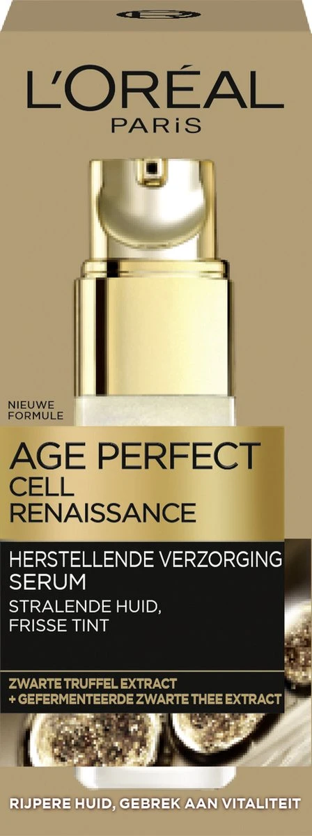De L’Oréal Paris Age Perfect Cell Renaissance serum 30 ml is de perfecte aanvulling op de Cell Renaissance dagcrème. Het serum versterkt namelijk de verstevigende werking van de dagcrème. Het serum bevat zwarte truffel, een exclusief ingrediënt dat de natuurlijke celvernieuwing van de huid ondersteunt. Vanaf het 55ste levensjaar is de huid vaak droger en kan teer of broos worden. Het Age Perfect serum is de ultieme verzorging voor de rijpere huid. Het helpt de huid versterken, waardoor de huid zijn stevigheid hervindt. De formule met rijke ingrediënten zorgt voor een compactere huid die niet verslapt.