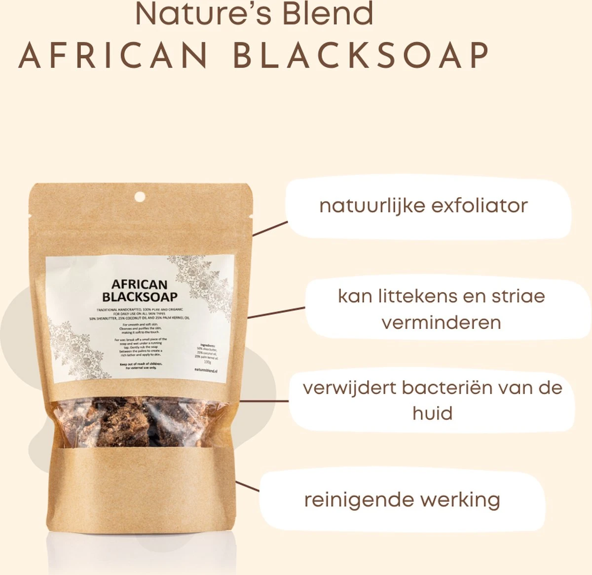 De African black soap van Nature’s Blend wordt geïmporteerd uit West-Afrika, waar de zeep wordt geproduceerd op de traditionele manier van duizenden jaren. Deze 100% natuurlijke zeep wordt met de hand gemaakt. De zeep kan gebruikt worden voor gezicht en lichaam en is geheel verantwoord, zowel voor de mens als voor de natuur.