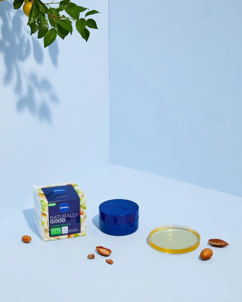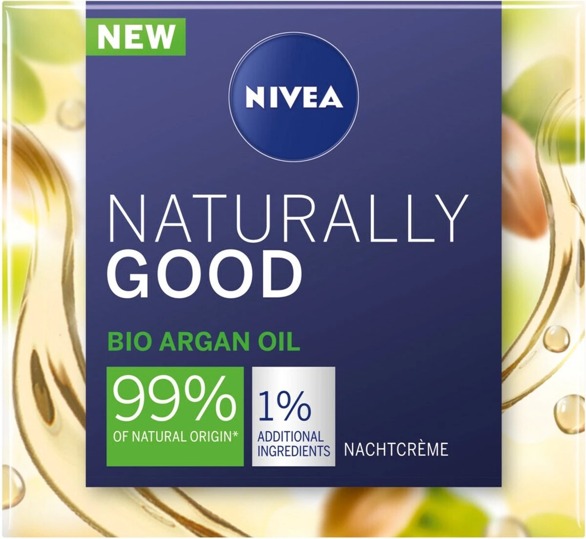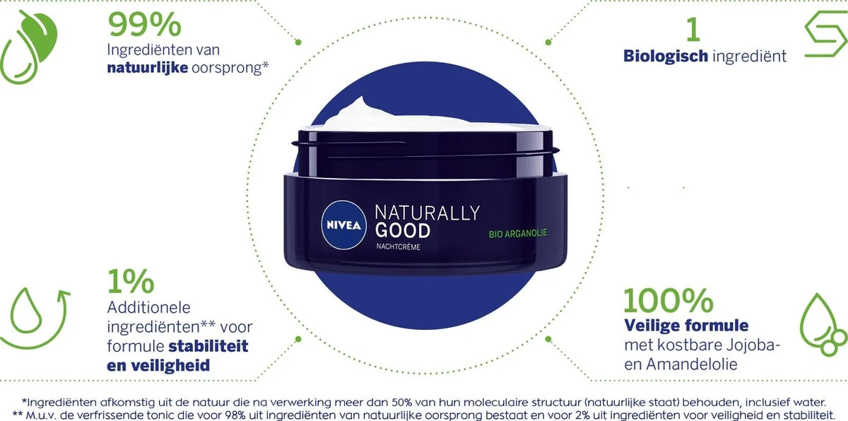 NIVEA Naturally Good Nachtcrème is gemaakt van 99% ingrediënten van natuurlijke oorsprong* en 1% additionele ingrediënten voor formule stabiliteit en veiligheid en biedt 100% transparantie over alle ingrediënten die erin zitten. De regenererende formule met bio Arganolie laat de huid de volgende ochtend soepel aanvoelen. Het helpt het herstellend vermogen van de huid te ondersteunen gedurende de nacht – voor een uitgerust ogende huid in de ochtend. Huidvriendelijkheid dermatologisch goedgekeurd.
