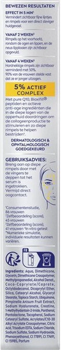 De rimpelopvuller vult rimpels in vijf minuten op en helpt rimpels dag na dag te bestrijden. Het serum dringt in de diepe lagen van de opperhuid door om de collageenproductie te stimuleren en zo diepe rimpels te helpen bestrijden(4).