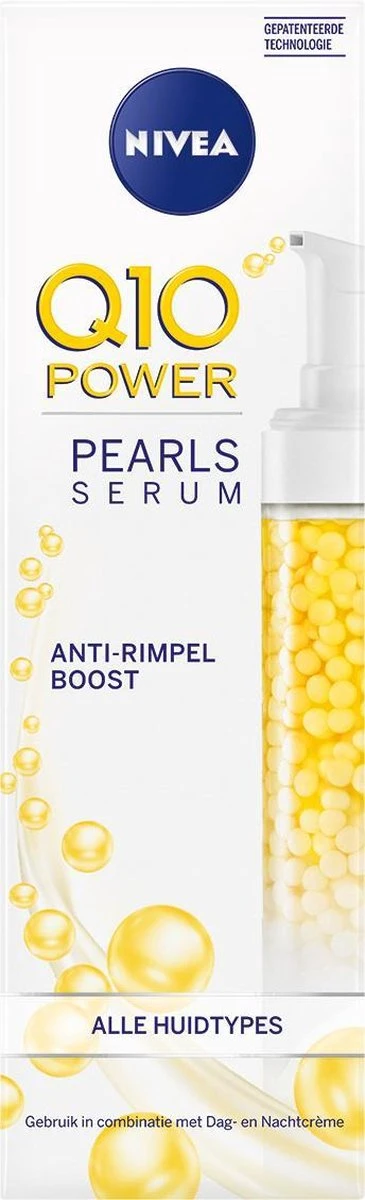 NIVEA Q10 POWER Anti-Rimpel + Verstevigende Caring Pearls bevatten de hoogste concentratie Q10 binnen de NIVEA Q10 POWER lijn en zijn gecombineerd met een hydraterende gel. Het resultaat: Een zeer effectief anti-rimpel product. De formule met het krachtige antioxidant Q10 en Creatine, zorgt voor een stevigere huid en verminderd rimpels zichtbaar.