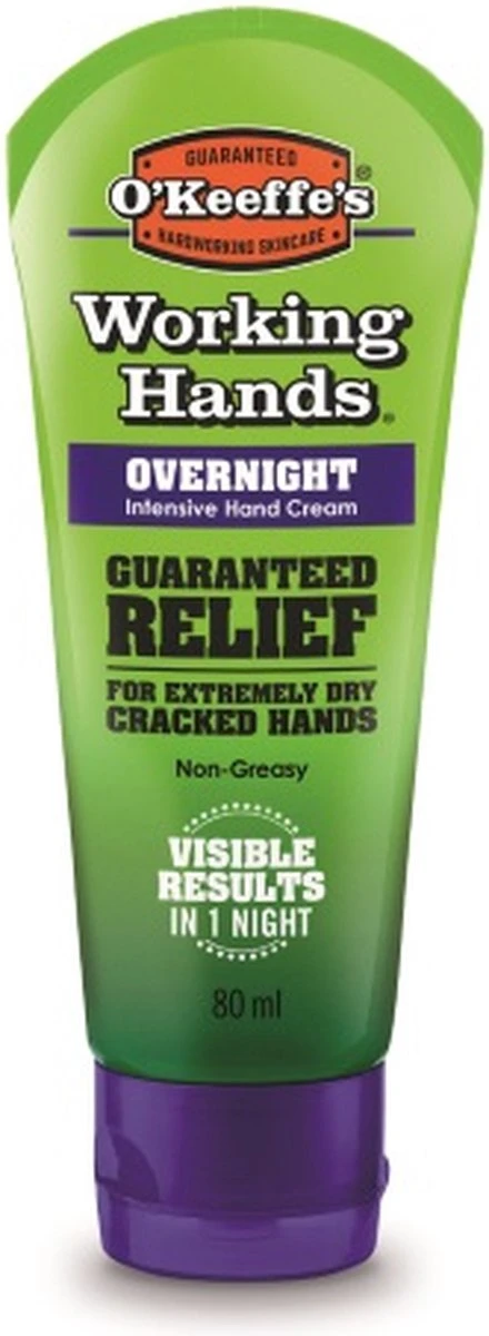 O’Keeffe’s Working Hands Overnight is een zeer efficiënte en intensief verzorgende handcrème, die voor de nacht wordt aangebracht. De handcrème bevat verzorgende oliën en helpt droge en gebarsten handen glad en zacht te maken.