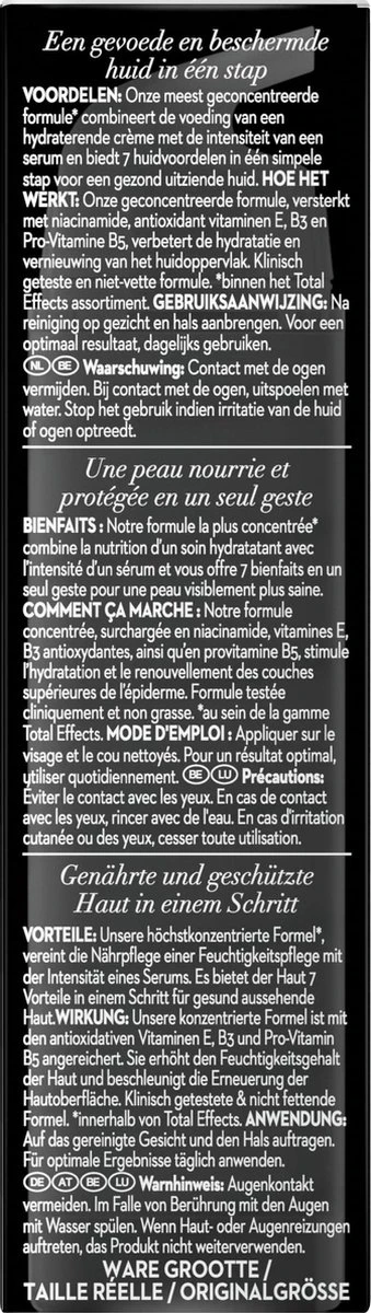 Een gevoede en beschermde huid in één stap! De meest geconcentreerde formule van Olay Total Effect (binnen Total Effects) combineert de voeding van een hydraterende crème met de intensiteit van een serum. Ze biedt 7 huidvoordelen in één eenvoudige stap voor een gezond uitziende huid.