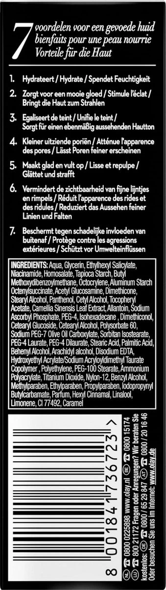 De geconcentreerde formule van Olay Total Effects zit vol met niacinamide en vitaminen B3, C, E en Pro-Vitamine B5, die antioxidanten bevatten, en de hydratatie en vernieuwing van het huidoppervlak verbeteren.