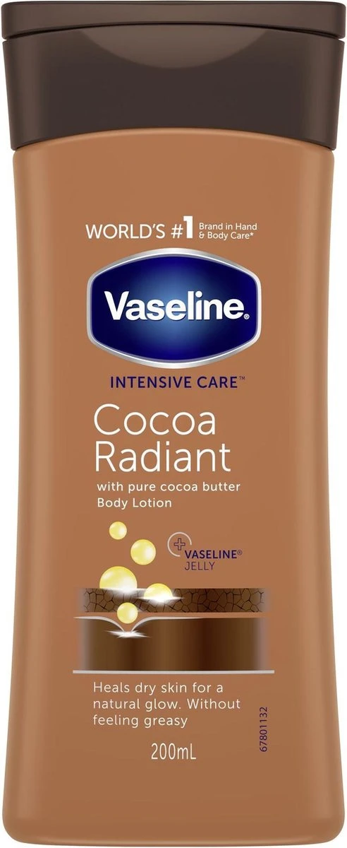 Vaseline Cocoa Radiant Bodylotion van de Intensive Care lijn herstelt en verzacht de droge huid op intensieve wijze, om de natuurlijke glans te onthullen. Deze bodylotion is verrijkt met pure cacaoboter. Dankzij de herstellende werking van dit ingrediënt wordt de huid intens gevoed en behoudt de huid zijn natuurlijke glans. Deze rijke bodylotion bevat vochtinbrengende bestanddelen die de droge- en doffe huid helpen herstellen. Dankzij de hoog geconcentreerde en herstellende ingrediënten van deze verzorgende lotion voelt je huid snel weer zijdezacht aan. Zo kun je je huid extra verzorgen wanneer jij dat nodig hebt. De hydraterende formule begint direct na het aanbrengen te werken. Hierdoor voelt je huid meteen al zachter aan. De lichte bodylotion trekt snel, plakt niet in en voelt niet vet aan; je hoeft dus niet lang te wachten. Vaseline Cocoa Radiant Bodylotion is een herstellende huidverzorging dankzij de toevoeging van microdruppels Vaseline. De Vaseline vormt een beschermend laagje op de huid dat vochtverlies helpt voorkomen, zonder vet aan te voelen. Zo zorgt deze lotion voor een beschermde en herstelde huid. Ook kalmeert de bodylotion de droge, onrustige huid en helpt het jeuk voorkomen. Vaseline is bij velen bekend om de potjes Vaseline Protecting Jelly, en wordt vaak ook wel ‘Wonder Jelly’ genoemd. Vaseline is 150 jaar geleden uitgevonden in Amerika, en staat erom bekend om op een veilige manier de huid te helpen herstellen. Dit potje is de oorsprong van alle Vaseline-producten, waaronder ook deze Vaseline Intensive Care Cocoa Radiant Bodylotion. Voor een optimale huidverzorging kun je ook gebruik maken van andere Vaseline-producten zoals de voedende handcrèmes of de zachte lipcrèmes.