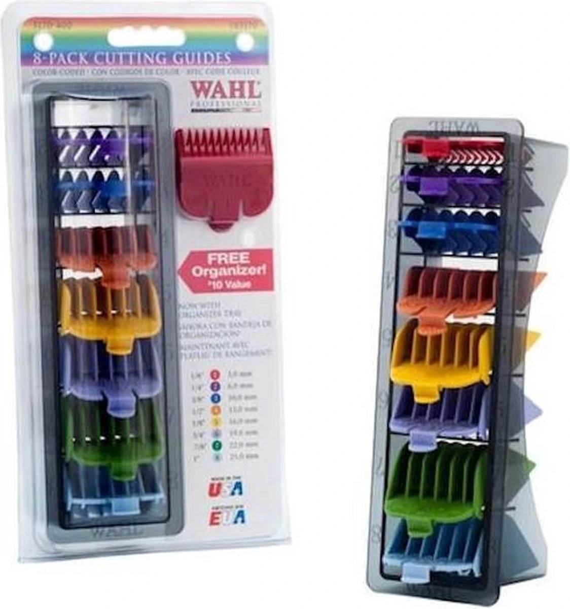 Wahl Set Opzetkammen Gekleurd 3-25mm bevat 8 gekleurde opzetkammen geschikt voor Wahl tondeuses. De set bevat kammen van 3mm, 6mm, 10mm, 13mm, 16mm, 19mm, 22mm en 25mm. Er wordt een gratis organizer bijgeleverd waarin je de opzetkammen makkelijk kan opbergen. Elke kam heeft een eigen kleur, waardoor je makkelijk kan onthouden welke lengte je de vorige keer hebt gebruikt. De opzetkammen passen op de volgende Wahl tondeuses: