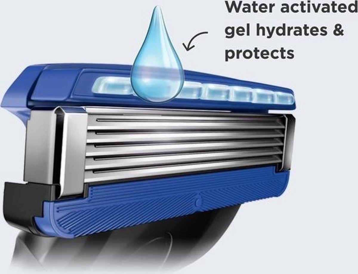 - De Hydro 5 heeft geen glijstrip als andere scheersystemen, maar een innovatief gel-reservoir**. Dit wordt door water geactiveerd en zorgt voor 40% minder wrijving**. De geavanceerde gelformule met Aloë vera en vitamine E bedekt de huid als een beschermend laagje en zorgt voor moeiteloos glijden, zelfs bij herhaalde scheerbewegingen. Bovendien wordt de huid tijdens het scheren gehydrateerd.